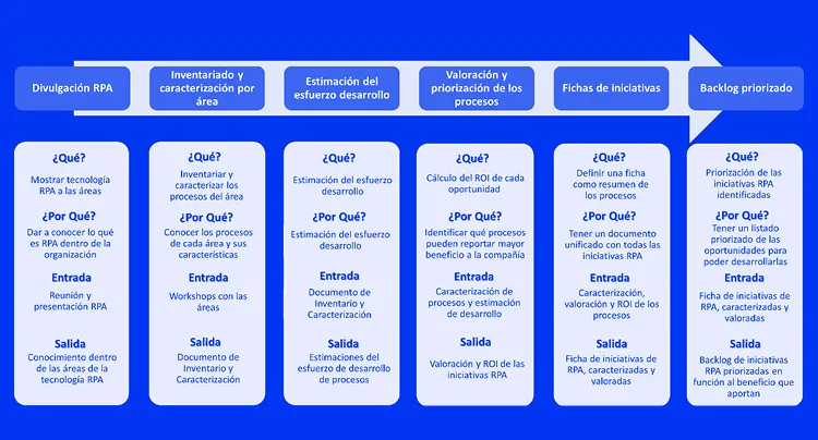El objetivo de esta fase consiste en cumplimentar una ficha por cada una de las propuestas de proceso para ser automatizada. Estas fichas incluirán indicadores clave de la oportunidad como ROI, esfuerzo de desarrollo, beneficios estimados, y servirán para tener mayor control a la hora de empezar a desarrollar las oportunidades RPA.