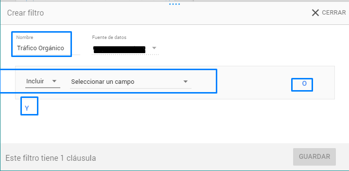 O → Una vez insertada la primera cláusula, haciendo clic en “=” se añadir otra línea debajo de la primera en la que se puede añadir otra variable de la primera cláusula. Por ejemplo, si además del tráfico orgánico queremos incluir el tráfico Referral.